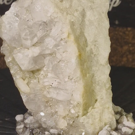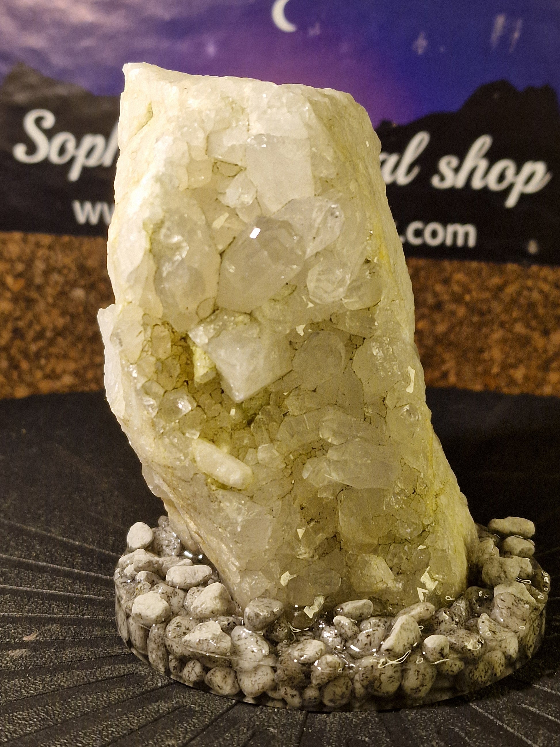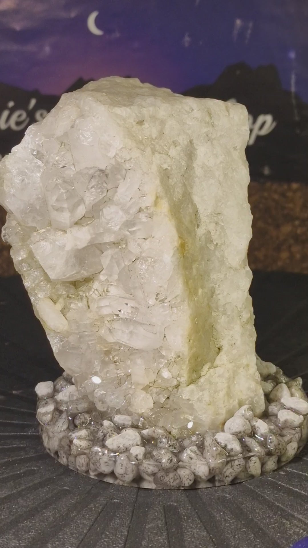 Kvartsen har en markant, rå struktur med flot gennemsigtighed og naturlige formationer, som gør den helt unik. Basen er støbt i resin og dekoreret med ægte småsten, hvilket giver stabilitet og et flot æstetisk løft.