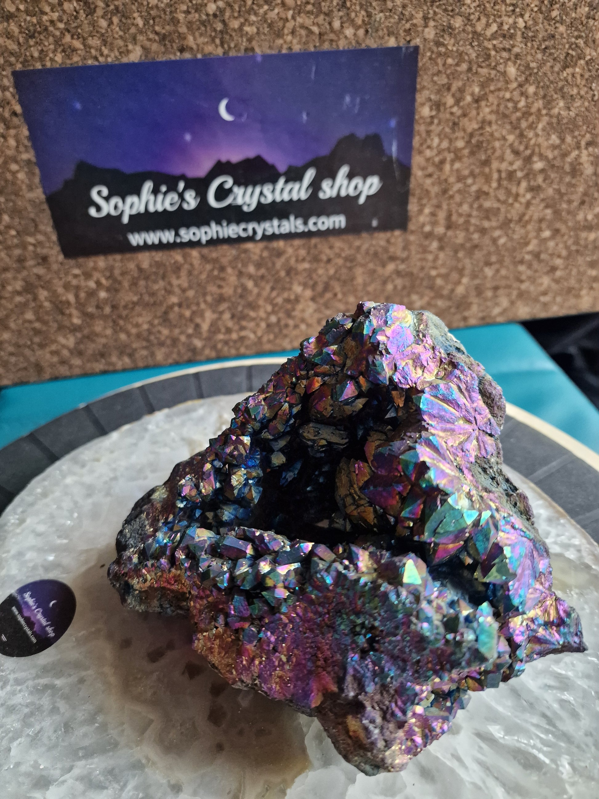 Denne imponerende Titanium Aura krystal vejer ca. 1400 gram og har en kraftfuld tilstedeværelse med sin unikke, rå form. Krystallen måler cirka 14 cm i længden, 14 cm i bredden og 11 cm i højden, hvilket gør den til et iøjnefaldende stykke til enhver krystalsamling eller som dekorativt element i hjemmet.