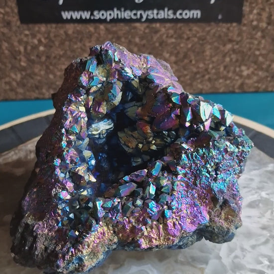 Titanium Aura er skabt ved at binde titanium til en naturlig krystal ved hjælp af en speciel proces, hvilket giver stenen dens spektakulære metalliske regnbuefarver med nuancer af blå, lilla, guld og pink. Overfladen reflekterer lyset smukt og skaber en næsten magisk glans.